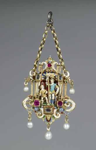 | Keywords: Reinhold Vasters - Renaissance-Style Pendant with Judith Holding the Head of Holofernes - Walters 44424 - Side B.jpg This elaborate double-sided pendant depicts two biblical scenes The side displayed here shows Judith with a sword in her right hand and the head of Holofernes in the other With the help of her maid she is about to drop the head into a bag The other side of the pendant portrays David about to swing his sling at Goliath who appears in the dress of a Roman military leader century 19 gold enamel diamonds rubies pearls cm 5 3 accession number 44 424 39009 Frederic Spitzer date and mode of acquisition unknown Sale Paris 1893 Catalogue des Objet d'Art no 1840 Henry Walters city Baltimore Walters Art Museum Henry Walters Acquired by Henry Walters 1893 Jewelry - Ancient to Modern The Walters Art Gallery Baltimore 1979-1980 Court Jewels of the Renaissance 1500-1630 Victoria and Albert Museum London 1980-1981 Artful Deception The Craft of the Forger The Walters Art Gallery Baltimore; Edsel Eleanor Ford House Grosse Pointe Shores; Dallas Museum of Art Dallas; Oklahoma City Museum of Art Oklahoma City; Portland Museum of Art Portland; The Fine Arts Center at Cheekwood Nashville; Phoenix Art Museum Phoenix; Columbia Museum of Art Columbia; Elvehjem Museum of Art Madison; Crocker Art Museum Sacramento; Memorial Art Gallery of the University of Rochester Rochester; The Barnum Museum Bridgeport 1987-1992 Bedazzled 5 000 Years of Jewelry from the Walters Art Museum Frist Center for the Visual Arts Nashville; The John and Mable Ringling Museum of Art Sarasota; The Walters Art Museum Baltimore 2006-2009 Bedazzled 5 000 Years of Jewelry El Paso Museum of Art El Paso 2010 place of origin Aachen Germany Walters Art Museum license Jewellery in the Walters Art Museum Reinhold Vasters David and Goliath Media contributed by the Walters Art Museum needs category review |