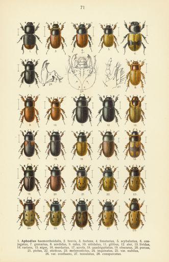 Keywords: Reitter-1908 table71.jpg See image for index to numbers Aphodius haemorrhoidalis <small>L </small> Aphodius haemorrhoidalis <small> Linnaeus 1758 </small> adult dorsal view Aphodius brevis <small>Er </small> Aphodius brevis <small> Erichson 1848 </small> 2<sup>a</sup> head of larva<sup>unverified - check</sup> dorsal view 2<sup>b</sup> mandible of adult<sup>unverified - check</sup> 2<sup>c</sup> maxilla of adult<sup>unverified - check</sup> Aphodius foetens <small>Fabr </small> Aphodius foetens <small> Fabricius 1787 </small> adult dorsal view Aphodius fimetarius <small>Lin </small> Aphodius fimetarius <small> Linnaeus 1758 </small> adult dorsal view Aphodius scybalarius <small>Fbr </small> Aphodius rufus <small> Moll 1782 </small> var scybalarius adult dorsal view Aphodius conjugatus sic <small>Panz </small> Aphodius coniugatus <small> Panzer 1795 </small> adult dorsal view Aphodius granarius <small>Lin </small> Aphodius granarius <small> Linnaeus 1767 </small> adult dorsal view Aphodius sordidus <small>Fabr </small> Aphodius sordidus <small> Fabricius 1775 </small> adult dorsal view Aphodius rufus <small>Moll </small> Aphodius rufus <small> Moll 1782 </small> adult dorsal view Aphodius nitidulus <small>Fabr </small> Aphodius ictericus ictericus <small> Laicharting 1781 </small> adult dorsal view Aphodius gibbus <small>Germ </small> Aphodius gibbus <small>Germar in Ahrens 1817</small> adult dorsal view Aphodius ater <small>Degeer </small> Aphodius ater <small> De Geer 1774 </small> adult dorsal view Aphodius lividus <small>Oliv </small> Aphodius lividus <small> Olivier 1789 </small> adult dorsal view Aphodius varians <small>Duft </small> Aphodius varians <small>Duftschmid 1805</small> adult dorsal view Aphodius niger <small>Panz </small> Aphodius varians <small>Duftschmid 1805</small> f niger adult dorsal view Aphodius merdarius <small>Fbr </small> Aphodius merdarius <small> Fabricius 1775 </small> adult dorsal view Aphodius scrofa <small>Fabr </small> Aphodius scrofa <small> Fabricius 1787 </small> adult dorsal view Aphodius quadriguttatus <small>Hrbst </small> Aphodius quadriguttatus <small> Herbst 1783 </small> adult dorsal view Aphodius obscurus <small>F </small> Aphodius obscurus obscurus <small> Fabricius 1792 </small> adult dorsal view Aphodius porcus <small>Fbr </small> Aphodius porcus <small> Fabricius 1792 </small> adult dorsal view Aphodius pictus <small>Strm </small> Aphodius pictus <small>Sturm 1805</small> adult dorsal view Aphodius sticticus <small>Panz </small> Volinus sticticus <small> Panzer 1798 </small> adult dorsal view Aphodius melanostictus <small>Schmdt </small> Aphodius melanostictus <small>W Schmidt 1840</small> adult dorsal view Aphodius inquinatus <small>Fbr </small> sic Aphodius distinctus distinctus <small> O F Müller 1776 </small> adult dorsal view Aphodius inquinatus a nubilus <small>Panz </small> Aphodius distinctus distinctus <small> O F Müller 1776 </small> f nubilus adult dorsal view Aphodius inquinatus a confluens <small>Schilsky</small> Aphodius distinctus distinctus <small> O F Müller 1776 </small> f confluens adult dorsal view Aphodius tessulatus <small>Payk non Laicharting 1781 preoccupied </small> Aphodius paykulli <small>Bedel 1907</small> adult dorsal view Aphodius conspurcatus <small>Lin </small> Aphodius conspurcatus <small> Linnaeus 1758 </small> adult dorsal view Fauna Germanica Die Käfer des deutschen Reiches http //caliban mpiz-koeln mpg de/reitter2/index html vol II pl 71 creator Edmund Reitter 1908 PD-old Aphodius_coniugatus_-_Reitter jpg Reitter - Die Käfer des Deutschen Reichs Coleoptera anatomy Coleoptera larvae Aphodiinae Aphodius haemorrhoidalis Aphodius brevis Aphodius foetens Aphodius fimetarius Aphodius rufus Aphodius Aphodius sordidus Aphodius ictericus Aphodius ater Aphodius lividus Aphodius porcus Aphodius Chilothorax Volinus sticticus Aphodius distinctus Aphodius paykulli |