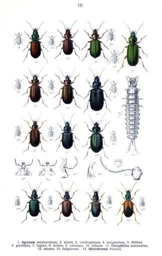 | Keywords: Reitter Agonum u.a..jpg See image for index to numbers Agonum sexpunctatum <small>L </small> Agonum sexpunctatum <small> Linnaeus 1758 </small> 1<sup>a</sup> size comparison 1<sup>b</sup> adult dorsal view Agonum ericeti <small>Panz </small> Agonum ericeti <small> Panzer 1809 </small> 2<sup>a</sup> size comparison 2<sup>b</sup> adult dorsal view Agonum viridicupreum <small>Goeze </small> Agonum viridicupreum <small> Goeze 1777 </small> 3<sup>a</sup> size comparison 3<sup>b</sup> adult dorsal view Agonum marginatum <small>Lin </small> Agonum marginatum <small> Linnaeus 1758 </small> 4<sup>a</sup> larva dorsal view 4<sup>b</sup> size comparison 4<sup>c</sup> adult dorsal view Agonum Mülleri <small>Hrbst </small> Agonum muelleri <small> Herbst 1784 </small> 5<sup>a</sup> size comparison 5<sup>b</sup> adult dorsal view Agonum gracilipes <small>Dftsch </small> Agonum gracilipes <small> Duftschmid 1812 </small> 6<sup>a</sup> size comparison 6<sup>b</sup> adult dorsal view Agonum lugens <small>Dftsch </small> Agonum lugens <small> Duftschmid 1812 </small> 7<sup>a</sup> size comparison 7<sup>b</sup> adult dorsal view Agonum dolens <small>Sahlb </small> Agonum dolens <small> C R Sahlberg 1827 </small> 8<sup>a</sup> size comparison 8<sup>b</sup> adult dorsal view Agonum versutum <small>Gyll </small> Agonum versutum <small>Sturm 1824</small> 9<sup>a</sup> size comparison 9<sup>b</sup> adult dorsal view Agonum viduum <small>Panz </small> Agonum viduum <small> Panzer 1796 </small> 10<sup>a</sup> size comparison 10<sup>b</sup> adult dorsal view 10<sup>c</sup> head dorsal view 10<sup>d</sup> labrum 10<sup>e</sup> mandible 10<sup>f</sup> maxilla 10<sup>g</sup> labium dorsal view 10<sup>h</sup> labium ventral view Europhilus antennarius <small>Dftsch </small> Agonum antennarium <small> Duftschmid 1812 </small> 11<sup>a</sup> size comparison 11<sup>b</sup> adult dorsal view Europhilus micans <small>Dej </small> Agonum micans <small> Nicolai 1822 </small> 12<sup>a</sup> size comparison 12<sup>b</sup> adult dorsal view Europhilus fuliginosus <small>Panz </small> Agonum fuliginosum <small> Panzer 1809 </small> 13<sup>a</sup> size comparison 13<sup>b</sup> adult dorsal view Idiochroma dorsalis <small>Pontopp </small> Anchomenus dorsalis <small> Pontoppidan 1763 </small> 14<sup>a</sup> size comparison 14<sup>b</sup> adult dorsal view Fauna Germanica Die Käfer des deutschen Reiches http //caliban mpiz-koeln mpg de/reitter1/index html vol I pl 16 Farbendrucktafeln von Dr K G Lutz K G Lutz' Verlag Stuttgart creator Edmund Reitter 1908 PD-old <gallery> File Reitter-1908 table16 jpg Alternate version </gallery> Reitter - Die Käfer des Deutschen Reichs Coleoptera anatomy Agonum sexpunctatum Agonum ericeti ericeti Agonum viridicupreum Agonum marginatum Agonum muelleri Agonum gracilipes Agonum lugens Agonum dolens Agonum versutum Agonum viduum Agonum antennarium Agonum fuliginosum Anchomenus dorsalis |