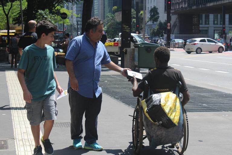 | Keywords: Relação de Poder no Brasil.jpg  pt-br Morador de rua recebendo comida de alguém que passava pela calçada Fotografia tirada na esquina da Avenida Paulista com a Alameda Casa Branca em 19 de março de 2016 own Marina Arena 19 de março de 2016 Projeto Commons da Faculdade Cásper Líbero RTVI/2016 Desigualdade Social Pobreza |