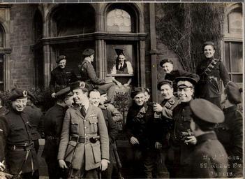Keywords: london and north western hotel londonandnorthwesternhotel north wall northwall dublin ireland leinster black and tans blackandtans auxiliaries auxies damage broken windows brokenwindows irish war of independence irishwarofindependence i.r.a. ira irish republican army irishrepublicanarmy uniforms berets pistols belts goggles caps crests april 1921 1920s twenties hogan-wilson collection hoganwilsoncollection dúchrónaigh cogadh na saoirse cogadhnasaoirse q company qcompany w.d. hogan wdhogan hogan collection hogancollection national library of ireland nationallibraryofireland people monochrome This shot of joking Black and Tans and Auxiliaries was taken outside the London and North Western Hotel, North Wall, Dublin as they surveyed the damage after an I.R.A. attack on their quarters. Written on the mount of this photo was "Tans glad to have escaped the bombs thrown at their headquarters in Dublin". The next day's Irish Times started a long report with these paragraphs: "... the hotel, which is at present occupied by Auxiliary police, was attacked shortly before eight o'clock yesterday morning by a party of men with bombs and rifles. The police returned the fire, and one of the attackers was seriously wounded and has since been taken to George V. Hospital. Two other men were also wounded and are now patients in the Mater Hospital. Another account from an authoritative source says that twelve bombs were thrown at the windows of the hotel, which is occupied by members of the Auxiliary police force employed on duty at the docks. Six men fired revolvers at the windows. Fire was returned by the police and one man was killed in the act of throwing a bomb, and one cadet was slightly wounded..." Date: Monday, 11 April 1921 NLI Ref.: HOGW 117 This shot of joking Black and Tans and Auxiliaries was taken outside the London and North Western Hotel, North Wall, Dublin as they surveyed the damage after an I.R.A. attack on their quarters. Written on the mount of this photo was "Tans glad to have escaped the bombs thrown at their headquarters in Dublin". The next day's Irish Times started a long report with these paragraphs: "... the hotel, which is at present occupied by Auxiliary police, was attacked shortly before eight o'clock yesterday morning by a party of men with bombs and rifles. The police returned the fire, and one of the attackers was seriously wounded and has since been taken to George V. Hospital. Two other men were also wounded and are now patients in the Mater Hospital. Another account from an authoritative source says that twelve bombs were thrown at the windows of the hotel, which is occupied by members of the Auxiliary police force employed on duty at the docks. Six men fired revolvers at the windows. Fire was returned by the police and one man was killed in the act of throwing a bomb, and one cadet was slightly wounded..." Date: Monday, 11 April 1921 NLI Ref.: HOGW 117 |