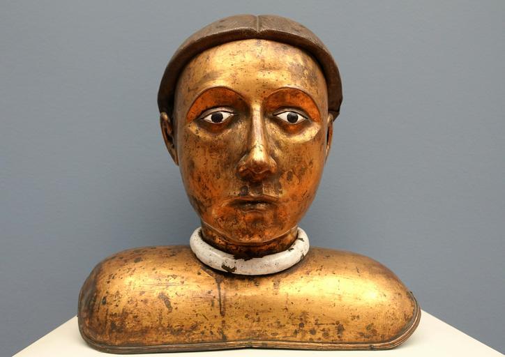 Keywords: Reliquary bust of a male saint, France, perhaps Burgundy, 1400-1450, enamelled and gilt copper - Bode-Museum - DSC03222.JPG en Exhibit in the Bode-Museum Berlin Germany This work is in the public domain because the artist died more than 100 years ago Photography was permitted in the museum without restriction 2014-11-12 11 07 44 own Daderot other versions PD-old-100 cc-zero Gothic sculpture in the Bode-Museum Uploaded with UploadWizard |