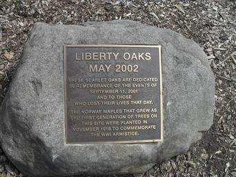 Keywords: remembrance plaque dedicated 9 11 commemorate commemoration commemorative monument mourning memorial metal monument memory condolences rock liberty oaks scarlet oaks events september 11 2001 11 september 2001 new york city close-up 11 september terrorist attack etched bronze iron new york norway maples trees planted wwi armistice wwi armistice world war i ww1 brooklyn botanic gardens brooklyn