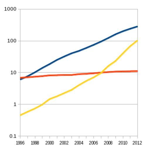 Keywords: Renewables-timeline.png en Logarithmical graph showing exponential growth of usage of wind and solar energy in 1996-2012 World installed capacity shown in GW wind dark blue solar yellow geothermal red pl Wykres w skali logarytmicznej pokazujący wykładniczy wzrost wykorzystania energii wiatrowej i słonecznej na świecie w latach 1996-2012 Zainstalowana moc podana jest w GW Energia wiatrowa zaznaczona na niebiesko słoneczna na żółto geotermiczna na czerwono own based on data from http //www bp com/liveassets/bp_internet/globalbp/globalbp_uk_english/reports_and_publications/statistical_energy_review_2011/STAGING/local_assets/spreadsheets/statistical_review_of_world_energy_full_report_2011 xls http //www wwindea org/home/index php option com_content task view id 345 Itemid 43 http //www epia org/index php eID tx_nawsecuredl u 0 file fileadmin/EPIA_docs/publications/epia/EPIA-market-report-2011 pdf t 1330608964 hash 63b6f91da0ed866e0fa26306107c04b4 AI Graphic 2012-06-11 Renewable energy statistics Cc-zero |