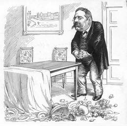 | Keywords: Rent bord.jpg sv 1895 hade statsminister Boström tillsatt ett hemligt riksdagsutskott för att hantera unionsfrågan 1905 föreslog han samma åtgärd vilken också genomfördes Överläggningarna i detta utskott havererar dock Kronprinsens fredliga linje mötte motstånd från både regerings- och riksdagshåll Det ledde bland annat till att statsminister Boström avgick och en ny regering under statsminister Ramstedt tillträdde Trots detta lyckades man ändå inte nå enighet i utskottet Det illustreras av denna bild med justitieministern Berger som källarmästare Rent bord med källarmästare Berger justitieministern Han betraktar ruinerna dagen efter och utbrister Oj oj min dyrbara servis Visserligen var det bara utskottsporslin Men var ska jag nu få tag i något folk som tar upp den Puck 11 maj 1905; http //www pressehistorisk no/index asp id 98787 Norsk pressehistorisk forening Edvard Forsström 1905 PD-Art 1905 cartoons Edvard Forsström Ossian Berger Union between Sweden and Norway |