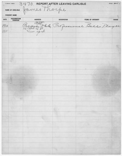 Keywords: Report After Leaving - NARA - 595404.jpg Scope and content General notes 595404 Local identifier Department of the Interior Office of Indian Affairs Carlisle Indian School 1879 - 1918 Archives I Reference Section Textual Archives Services Division NWCT1R National Archives Building 7th and Pennsylvania Avenue NW Washington DC 20408 1915 Record group Record Group 75 Records of the Bureau of Indian Affairs 1793 - 1999 Record group ARC 404 Student Records compiled 1879 - 1918 Series ARC 300327 File unit Jim Thorpe Student File 1904 - 1915 File unit ARC 595333 Variant control numbers Other versions <gallery> File Report_After_Leaving_-_NARA_-_595404 tif tif File Report_After_Leaving_-_NARA_-_595404 jpg jpg </gallery> NARA-cooperation PD-USGov Jim Thorpe |