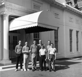 | Keywords: u.s. national archives usnationalarchives jfk presidential library jfkpresidentiallibrary blackandwhite monochrome black and white Original Caption: Representative Ken Hechler (West Virginia) Poses with Guests at the White House We are looking for your help in identifying unknown people in our White House Photographs collection. If you have any information about this photograph, please post a comment, including any relevant sources, for the catalogers at the John F. Kennedy Presidential Library. Thank you! Local Identifier: JFKWHP-KN-22187 Created By: President (1961-1963 : Kennedy). Office of the Naval Aide to the President.(1961 - 1963) From: Collection JFK-WHP: White House Photographs, 12/19/1960 - 03/11/1964 Contact: John F. Kennedy Library (LP-JFK), Columbia Point Boston, MA 02125-3398 Phone: 617-514-1600 Fax: 617-514-1652 Email: kennedy.library@nara.gov Production Dates: 6/9/1962 Scope and Content Note: In this photograph, Representative Ken Hechler of West Virginia (center) poses with unidentified guests at the West Wing Entrance, White House, Washington, D.C. Persistent URL: JFK Library URL: www.jfklibrary.org/Asset-Viewer/Archives/JFKWHP-KN-22187.aspx.... Access Restrictions: Unrestricted Use Restrictions: Unrestricted Original Caption: Representative Ken Hechler (West Virginia) Poses with Guests at the White House We are looking for your help in identifying unknown people in our White House Photographs collection. If you have any information about this photograph, please post a comment, including any relevant sources, for the catalogers at the John F. Kennedy Presidential Library. Thank you! Local Identifier: JFKWHP-KN-22187 Created By: President (1961-1963 : Kennedy). Office of the Naval Aide to the President.(1961 - 1963) From: Collection JFK-WHP: White House Photographs, 12/19/1960 - 03/11/1964 Contact: John F. Kennedy Library (LP-JFK), Columbia Point Boston, MA 02125-3398 Phone: 617-514-1600 Fax: 617-514-1652 Email: kennedy.library@nara.gov Production Dates: 6/9/1962 Scope and Content Note: In this photograph, Representative Ken Hechler of West Virginia (center) poses with unidentified guests at the West Wing Entrance, White House, Washington, D.C. Persistent URL: JFK Library URL: www.jfklibrary.org/Asset-Viewer/Archives/JFKWHP-KN-22187.aspx.... Access Restrictions: Unrestricted Use Restrictions: Unrestricted |