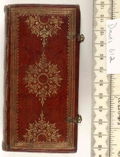 | Keywords: Respublica Romana - Upper cover (Davis612).jpg Style Pointille comprising dots Centrepiece made of small tools; Caption Upper cover; Colour Red; Edge Gilt exhibition history Decorative Technique Tooled in gold; Cover Material Goatskin includes morocco turkey etc A binding probably made in Holland Wooden boards The smooth spine is tooled in gold; ROM 1630 2 pairs of brass clasps shaped like shells Federico Macchi says The little chain Biblioteca Angelica Roma Legature di pregio p 90 n 37 on Bible New Testament in Greek Amsterdami apud Guiljelmum Blaeu 1633; Biblioteca Casanatense Roma Legature antiche e di pregio I p 483 n 994 II p 258 fig 396 on Respublica et status Regni Hungariae Lugduni Batavorum Ex officina Elzeviriana 1634 shelfmark aa XIII 30; Idem I p 484 n 997 II p 259 fig 397-398 on Cornelius Jansenius Notarum spongia quibus Alexipharmacum civibus sylvae-ducensibus nuper propinatum aspersit Gisbertus Voetius Minist Sylvae-duc Lovanii Typis ac sumptibus Iacobi Zegeri 1641 shelfmark dd XIII 2 seems to be derived by French contemporary binding decoration Collegio Borromeo Pavia Legature rinascimentali e barocche p XXIX n 49 on Themisti Cognomento Suadae orationis XIX graece et latinae coniunctum editae Parisiis apud Claudium Morellum 1618 object history Text 1626; Leiden; Unspecified object type Cc-zero place of creation Binding Netherlands place of discovery See M M Foot The Henry Davis Gift vol II London 1983 British Library image http //www bl uk/catalogues/bookbindings/LargeImage aspx RecordId 020-000004352 ImageId ImageId 41781 Copyright BL Respublica Romana Uploaded with GWToolset Respublica Romana - Upper cover Davis612 http //www webarchive org uk/bldatasets/bindings/6325_4 jpg Bookbinding 17th-century bookbinding British Library Bookbindings |