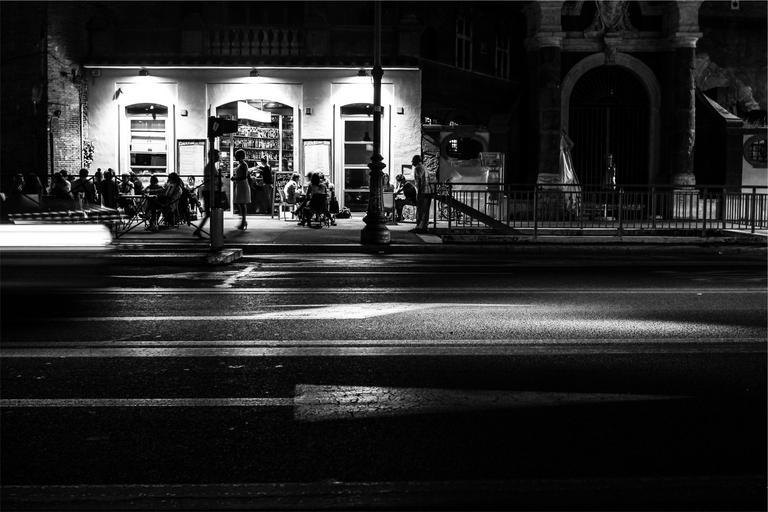 Keywords: restaurant people night patio street lamp posts sidewalk black and white