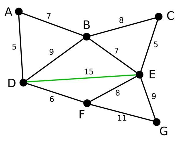 Keywords: Reverse Delete 1.svg The algorithm will start with the maximum weighted edge which in this case is DE with an edge weight of 15 Since deleting edge DE does not further disconnect the graph it is deleted Transferred from http //en wikipedia org en wikipedia; transferred to Commons by User Sefid par using http //tools wikimedia de/~magnus/commonshelper php CommonsHelper <br/> Original text self-made 2008-02-07 Terencehonles talk Original uploader was Terencehonles at http //en wikipedia org en wikipedia Released into the public domain by the author en wikipedia Terencehonles Original upload log page en wikipedia Reverse_Delete_1 svg 2008-02-07 09 55 Terencehonles 618×518× 18560 bytes <nowiki> self-made ~~~ </nowiki> Reverse Delete n