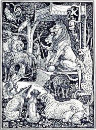 | Keywords: Reynard cycle characters.png en An illustration of King Noble his court and the beasts of the Reynard cycle Bottom to top left to right Grimbard the badger Rukenaw the ape Bellin the ram Laprel the rabbit Kyward the hare ; Reynard the fox Thibert the cat Panther; Isengrim the wolf Fière the lioness Noble the lion ; Bruin the bear Curtise the dog ; Chanticleer the rooster the The History of Reynard the Fox by Frederick Startridge Ellis creator Walter Crane 1897 PD-old Reynard cycle King Noble |