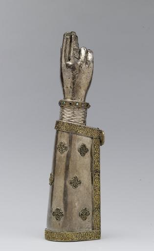 Keywords: Rhenish - Arm Reliquary of Saint Pantaleon - Walters 57688 - Back.jpg This silver arm is known as a speaking reliquary because it takes shape of the body part it once contained The reliquary reputedly held an arm bone of Saint Pantaleon a Holy Doctor martyred in Asia Minor AD 305 who later became the patron saint of physicians The remains of an inscription along the seam of the sleeve refer to the saint by name The small door with the two glass shields was added in the 15th century as was the crystal at the edge of the sleeve Reliquary late 13th century; Additions 15th century Medieval gilded silver with rock crystal semiprecious stones glass and niello cm 47 2 12 8 9 2 accession number 57 688 25190 A Tollin Paris Chevallier Mannheim Paris May 20 1897 no 79 Robert Hoe New York American Art Association New York February 15 1911 no 1813 Wareham Harding New York Henry Walters city Baltimore Walters Art Museum Henry Walters Acquired by Henry Walters 1920 Transcription Incomplete inscription in niello on the narrow silver strip ornamenting the seam of the sleeve DE SANCTI PANTALEONIS + AVE; Translation From Pantaleon greetings A Medieval Treasury from Southern Collections Ackland Art Center University of North Carolina at Chapel Hill Chapel Hill 1961 Reliquaries and Ritual Medieval Objects of Devotion The Walters Art Gallery Baltimore 1984-1985 Treasures of Heaven The Cleveland Museum of Art Cleveland; The Walters Art Museum Baltimore; The British Museum London 2010-2011 place of origin west Germany Walters Art Museum license Arm Reliquary of Saint Pantaleon |