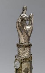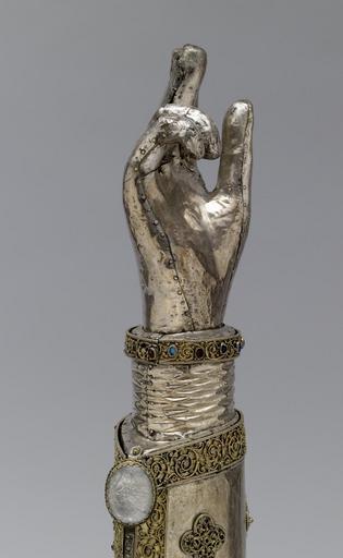 Keywords: Rhenish - Arm Reliquary of Saint Pantaleon - Walters 57688 - Detail B.jpg This silver arm is known as a speaking reliquary because it takes shape of the body part it once contained The reliquary reputedly held an arm bone of Saint Pantaleon a Holy Doctor martyred in Asia Minor AD 305 who later became the patron saint of physicians The remains of an inscription along the seam of the sleeve refer to the saint by name The small door with the two glass shields was added in the 15th century as was the crystal at the edge of the sleeve Reliquary late 13th century; Additions 15th century Medieval gilded silver with rock crystal semiprecious stones glass and niello cm 47 2 12 8 9 2 accession number 57 688 25190 A Tollin Paris Chevallier Mannheim Paris May 20 1897 no 79 Robert Hoe New York American Art Association New York February 15 1911 no 1813 Wareham Harding New York Henry Walters city Baltimore Walters Art Museum Henry Walters Acquired by Henry Walters 1920 Transcription Incomplete inscription in niello on the narrow silver strip ornamenting the seam of the sleeve DE SANCTI PANTALEONIS + AVE; Translation From Pantaleon greetings A Medieval Treasury from Southern Collections Ackland Art Center University of North Carolina at Chapel Hill Chapel Hill 1961 Reliquaries and Ritual Medieval Objects of Devotion The Walters Art Gallery Baltimore 1984-1985 Treasures of Heaven The Cleveland Museum of Art Cleveland; The Walters Art Museum Baltimore; The British Museum London 2010-2011 place of origin west Germany Walters Art Museum license Arm Reliquary of Saint Pantaleon Pointing in art |