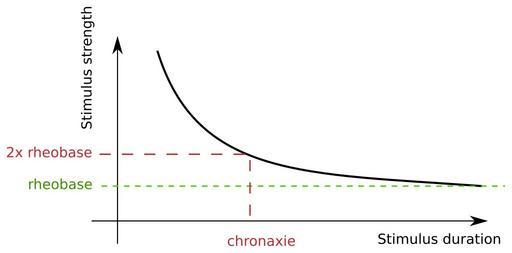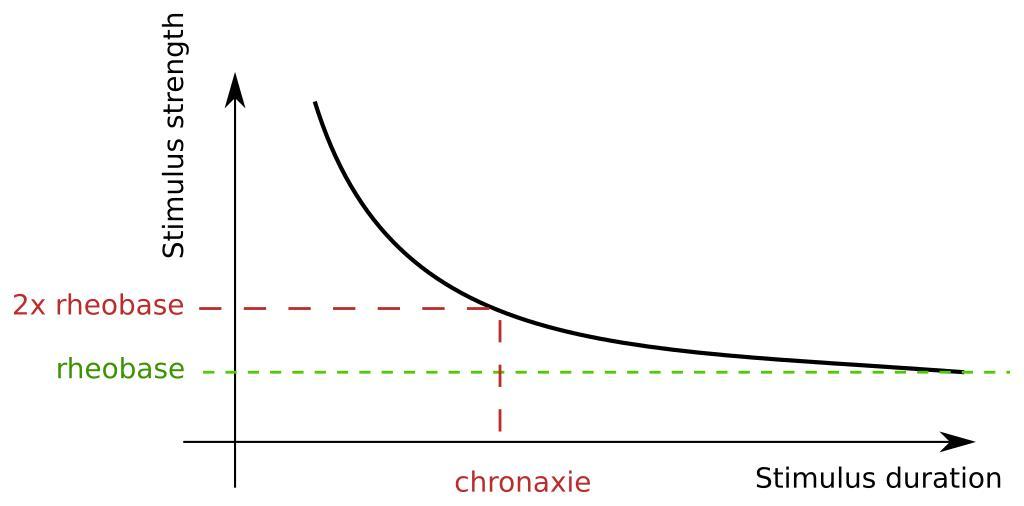 MAKE A MEME View Large Image Rheobase chronaxie.svg en Chronaxy is the shortest duration of an electrical stimulus where the threshold amplitude is twice the rheobase - the minimum required for eliciting an ACTION POTENTIAL at any time period It is a measure of the ...