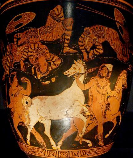 | Keywords: Rhesos MNA Naples.jpg Odysseus wearing the pilos hat and Diomedes stealing the horses of Thracian king Rhesus they have just killed Apulian red-figure situla from Ruvo Ulysse portant le pilos et Diomède volant les chevaux du roi thrace Rhésos qu'ils viennent de tuer Situle apulienne à figures rouges provenance Ruvo Vaso a forma di situla rinvenuto a Ruvo Reso re di Tracia e alleato dei Troiani aveva dei cavalli bianchi dei quali un oracolo aveva predetto che se fossero riusciti a bere l'acqua dello Xanto Troia non sarebbe stata presa Per questa ragione Ulisse e Diomede assalirono di notte Reso nel suo accampamento lo uccisero e condussero via i suoi celebri cavalli scena rappresentata sul vaso red-figure ceramic ca 360 BC own Institution Naples National Archaeological Museum exhibition history Iliade exhibition at the Colosseum September 2006 “February 2007 accession number inv 81863 photo date 2006 Marie-Lan Nguyen artwork license PD-old-100-1923 photo license Apulian pottery in the Museo Archeologico Naples Diomedes in ancient Greek pottery Odysseus in ancient Greek pottery Rhesus Thrace in ancient Greek pottery Horses in ancient Greek pottery Lycurgus Painter 360s BC Situlai Theft People with horses in art Stealing the horses of Rhesus Ancient Greek art from Ruvo di Puglia |