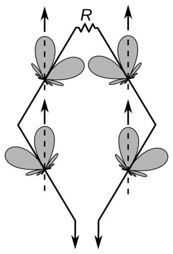 | Keywords: Rhombic antenna diagram.svg rhombic antenna showing how it works The rhombic antenna is a directional wire antenna used on MF and HF bands for shortwave reception The antenna consists of a wire suspended above the ground in the shape of a rhombus terminated at one end by a resistor equal the the wire's characteristic impedance about 400 to 600 ohms and at the other end connected to the feedline to the receiver The rhombic is a travelling wave antenna Each segment of the rhombus has a radiation pattern as shown grey having two lobes pointed forward at a certain angle By making the corner angle equal to twice the tilt angle the main lobes of each of the 4 sides point in the same direction and reinforce each other increasing the gain 2015-03-30 own Chetvorno other versions cc-zero Uploaded with UploadWizard Rhombic antennas |