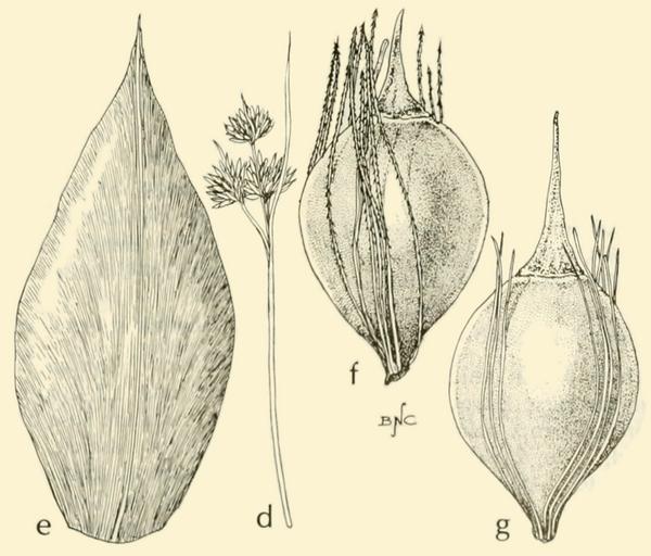 Keywords: Rhynchospora macra AWP-SW.png en Rhynchospora macra - Large beaksedge<br>d top of plant X 1;<br>e scale X 15;<br>f achene with usual bristles X 15;<br>g achene with unusual smooth bristles X 15 1972-01 Aquatic and Wetland Plants of the Southwestern United States Water Pollution Control Research Series Environmental Protection Agency Research and Monitoring January 1972 Page 475 Fig 245 Donovan S Correll Southern Methodist University and Helen B Correll Botanical Editor and Research for EPA Illustration courtesy of R K Godfrey other versions PD-USGov Rhynchospora macra Aquatic and wetland plants of southwestern United States |