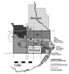 | Keywords: Richfield hist boundaries.png Map shows the partitioning of the town of Richfield starting in 1854 to the present day city of Richfield <br /> Map illustration by Joe Hoover 2007 for book Richfield Minnesota's Oldest Suburb published by the Richfield Historical Society Reproduced with permission of the artist and released to public domain courtesy of Joe Hoover ;Sources Johnson Fred <i>Richfield Minnesota's Oldest Suburb</i> 14 Richfield Richfield Historical Society Press David J Butler Did the Town of Richfield ever extend as far north as Franklin Avenue <i>Richfield Historical Society Bulletin</i> Summer 2006 3-4 Balcom <i>Early Richfield History</i> own 2007 Joe Hoover Myotus wikipedia en en wikipedia Myotus Joe Hoover Original upload log en wikipedia Innotata CommonsHelper en wikipedia Richfield_hist_boundaries png 2007-08-20 19 43 Myotus 650×699× 50884 bytes <nowiki>Map shows the partitioning of the town of Richfield starting in 1854 to the present day city of Richifield <br /> Map created by Joe Hoover 2007</nowiki> Richfield Minnesota Maps of Hennepin County Minnesota Fort Snelling History of Minneapolis Minnesota History of Minnesota |