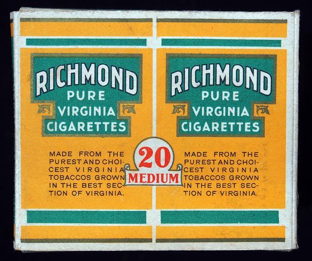 Keywords: Richmond cigarettes pack, pic1.JPG Very old packaging of a product that is not produced and not sold any more own 2014-04-13 09 32 44 Alf van Beem CC-Zero Trademarked Richmond cigarettes Cigarette packs