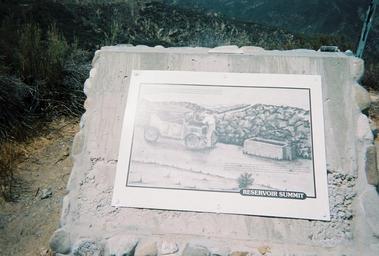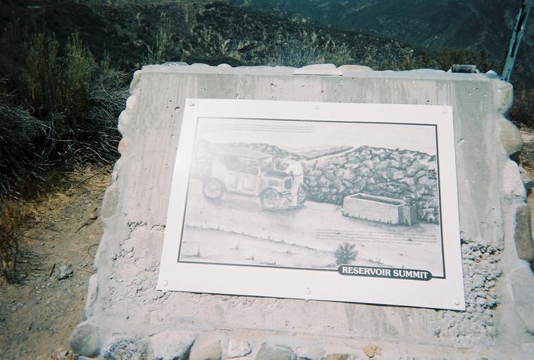 Keywords: Ridge Route Reservoir Summit hp.jpg Filling one's automobile radiator with water when traveling uphill is now a lost art with today's modern vehicles Until around the 1970's new cars and trucks could be counted on to need cooling down when engaged in mountain driving - and drivers would either pull off to the side of the road and run the engine at idle letting the fan cool the engine down <u>or</u> stop to add water to the radiator Sometimes both practices had to be done Drivers especially truck drivers would often wait for cooler nighttime temperatures before attempting to traverse the Ridge Route in order to avoid overheating and repair problems from it The sizable reservoir of water used to fill the small basin depicted here remains 500 feet west from this location and no longer is filled with water as it once was Other mountain highway locations in the United States used to carry barrels and/or piped water and basins similar to what is shown here but because modern vehicles do not overheat like they once did the practice has since been stopped Photo from private collection of avnative Avnative Ridge Route |