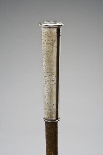 Keywords: Ridspö Cederström - Livrustkammaren - 86510.tif Ridspö med utdraget konisk form med en stomme av tagel horn och trä överklädd med flätad hampa nedtill röd snärt <br/><br/>Upptill ett 131 mm långt silverhandtag med vulstformiga kanter upptill och nedtill och på ena sidan graverad text i skrivstil Rittm v Krosiqk // Lt v Barnekow // Lt v Battensprung // Lt Buchard // Lt v Fresin // P Lt Hamann // Lt v Heuduck // Lt Koch // Lt v Nesewand // Lt v Paseck // P Lt Schuman // Lt Graf Schwerin // Lt Graf Scherr Thoss // Lt Frhr v Solemacher // Lt Graf zu Solms Laubach // Lt v Zerschvitz // Lt v Zylinilzki // Lt v Zvepffel // i/l // Freiherrn von Cederström // Hanover December 1888 På handtagets ovansida monogram M I R Militär Reit-Institut nedanför kunglig krona original caption Ridspö Cederström LRK 8923<br/> Nyckelord Detalj Ridspö Föremålsbild Ridutrustning 1888 horn - wood - silver g 200 size mm 764 32 LRK Bror Claes Arvid Cederström Generallöjtnant Trofast - hov och tass i kunglig tjänst 2010-2011 Livrustkammaren Trogna vänner - Kungliga hästar och hundar 2011-2012 Museiverket/Finlands nationalmuseum place of origin original filename lm_dig6451_8923 45470 inventory number LRK 8923 86510 CC-BY-SA Matti Östling Matti Östling Horse equipment Media contributed by LSH unmatched material Media contributed by LSH unmatched objKeyword Media contributed by LSH unmatched keyword Color images from Livrustkammaren Media contributed by LSH 2013-10 |