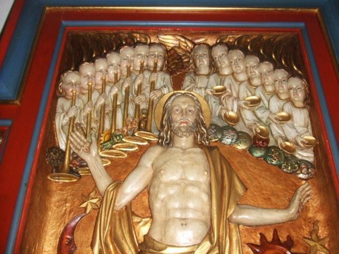 | Keywords: Riedlingen Neufra Pfarrkirche Altar detail 1.jpg Pfarrkirche St Peter und Paul Neufra an der Donau Stadt Riedlingen <br /> Jugendstilalatar in der Krypta gefertigt nach Entwürfen von Prof Karl Rieber durch Bildhauer Gabriel Lämmle own own photograph 2009 Photo Veit Feger Written permission by the author Veit Feger to license as Public Domain Veit Feger Pfarrkirche St Peter und Paul Neufra Gabriel Lämmle Book of Revelation | ||||