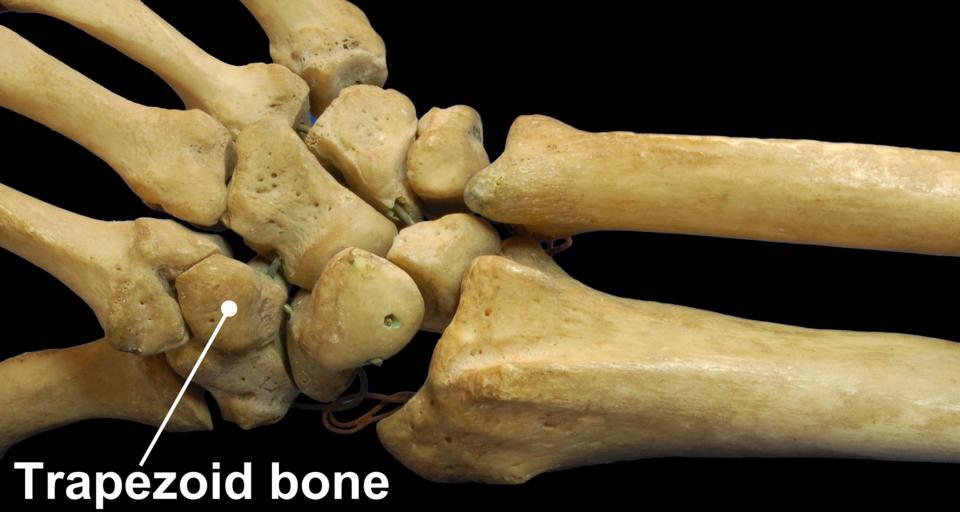| Keywords: RightHumanPosteriorDistalRadiusUlnaCarpals - Trapezoid bone.png Bones of human right hand with thumb on bottom Posterior surface dorsal surface Trapezoid bone labelled File RightHumanPosteriorDistalRadiusUlnaCarpals jpg 2013-11-11 Photo is by Brian C Goss No rights reserved -thumb left Original photo Trapezoid bone |
