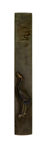 | Keywords: Rikuta Takenori - Kozuka with a Crane - Walters 51755.jpg At the bottom of the kozuka is a crane looking up to the sky Clouds are at the upper edge of the kozuka Cranes are symbols of longevity and an auspicious motif middle Other date century 19 late Edo-Meiji shibuichi gold copper cm 9 6 l accession number 51 755 9593 Henry Walters Baltimore date and mode of acquisition unknown Walters Art Museum Henry Walters Acquired by Henry Walters signature place of origin Mitsugu Hiroshima Japan Walters Art Museum license Kozuka in the Walters Art Museum Media contributed by the Walters Art Museum needs category review Rikuta Takenori |