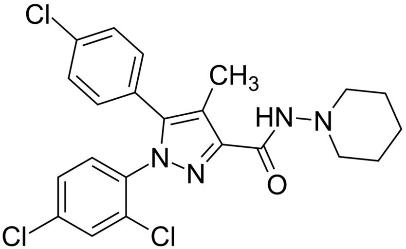 | Keywords: Rimonabant 200.svg  validSVG Structure of 5- 4-chlorophenyl -1- 2 4-dichlorophenyl -4-methyl-N- piperidin-1-yl -1H-pyrazole-3-carboxamide Own 2014-04-18 Emeldir <span class signature-talk >talk</span> Chemical structure verified https //upload wikimedia org/wikipedia/commons/1/19/Rimonabant_200 svg 1S/C22H21Cl3N4O/c1-14-20 22 30 27-28-11-3-2-4-12-28 26-29 19-10-9-17 24 13-18 19 25 21 14 15-5-7-16 23 8-6-15/h5-10 13H 2-4 11-12H2 1H3 H 27 30 JZCPYUJPEARBJL-UHFFFAOYSA-N 168273-06-1 Synonyms <small>5- 4-Chloro-phenyl -1- 2 4-dichloro-phenyl -4-methyl-1H-pyrazole-3-carboxylic acid piperidin-1-ylamide HCl 5- 4-Chlorophenyl -1- 2 4-dichlorophenyl -4-methyl-N- 1-piperidinyl -1H-pyrazole-3-carboxylic acid amide 5- p-Chlorophenyl -1- 2 4-dichlorophenyl -4-methyl-N-piperidinopyrazole-3-carboxamide Acomplia Rimocaban Rimonabant SR 141716 SR 141716A SR-141716 Zimulti</small> PD-chem Rimonabant |
