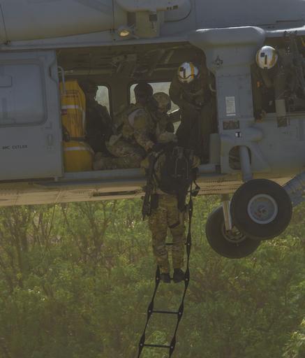 Keywords: RIMPAC 2014 140710-N-PX130-160.jpg en Members of a U S Marine Special Operations Team and Republic of Korea SEALs climb a ladder to an MH-60S Sea Hawk helicopter assigned to Helicopter Combat Squadron HSC 14 participating in an air assault exercise as part as Rim of the Pacific RIMPAC Exercise 2014 The world's largest international maritime exercise RIMPAC provides a unique training opportunity that helps participants foster and sustain the cooperative relationships that are critical to ensuring the safety of sea lanes and security on the world's oceans Twenty-two nations more than 40 ships six submarines more than 200 aircraft and 25 000 personnel are participating in RIMPAC U S Navy photo by Mass Communication Specialist 1st Class Daniel Gay/Released 2014-07-10 Petty Officer 1st Class Daniel Gay https //www dvidshub net/image/1446080 140710-N-PX130-160 2014-07-13 18 47 BELLOWS AIR FORCE STATION HI US PD-USGov-Military-Navy MH-60S Seahawk RIMPAC 2014 Images from DoD uploaded by Fæ |