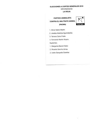 | Keywords: Rioja pacma generales 2016.jpg es Papeleta electoral de Partido Animalista contra el Maltrato Animal PACMA para el Congreso - Elecciones Generales de España de 2016 circunscripción de La Rioja 2016-08-05 own B25es other versions cc-zero PD-SpanishGov <br/> De minimis The party logo Ballot papers for the 2016 general election for La Rioja Spain Ballot papers for Partido Animalista Contra el Maltrato Animal Uploaded via Campaign bpsge | ||||