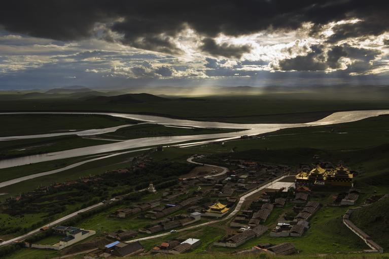 Keywords: river grassland prairie landscape nature sky grass scenic water green natural outdoor summer yellow river zoige blue summer landscape nature landscape cloud weather sun cloudscape temple light sunlight lamasery yellow golden