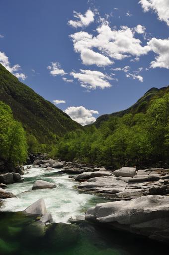 Keywords: river mountains alpine sky clouds switzerland ticino water blue green stones