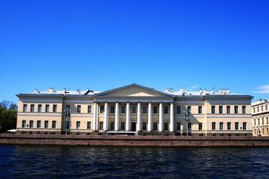 Keywords: river neva water blue embankment building pillars clear sky st petersburg