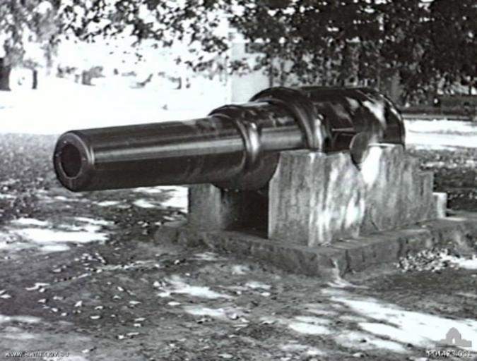 | Keywords: RML 10 inch gun HMVS Cerberus Ballarat AWM P01473.001.jpeg AWM caption BALLARAT VIC A 10 INCH MUZZLE LOADING RIFLED ARMSTRONG GUN NUMBERED 17 WHICH WAS MANUFACTURED AT THE ROYAL GUN FOUNDRY WOOLWICH ENGLAND IN 1869 THIS GUN FORMED PART OF THE MAIN ARMAMENT OF HMVS CERBERUS IN 1884 DURING GUNNERY PRACTICE CRACKS WERE FOUND AROUND THE RIGHT HAND TRUNNION AND THE GUN WAS SENT TO A FOUNDRY IN BALLARAT FOR REPAIR THE REPAIR WORK WAS BEYOND THE CAPACITY OF THE FOUNDRY AND THE GUN REMAINED IN BALLARAT AFTER SOME YEARS ON DISPLAY IN A PARK IN BALLARAT IT WAS MOVED ABOUT 1986 TO HMAS CERBERUS P01473 001 ORIGINAL NEGATIVE HOUSED IN P RUN IN AWM ARCHIVE STORE DONOR G LYALL not later than 1986 photographer not identified Copyright expired - public domain PD-AustraliaGov RML 10 inch 18 ton Gun HMVS Cerberus ship 1868 Monuments and memorials in Ballarat Black and white photographs |