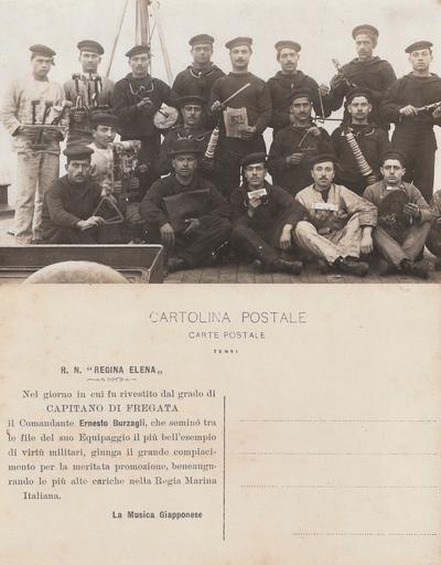 | Keywords: RN Regina Elena - Post Card.jpg 1914 Commemorative postcard from the crew of His Majesty's Italian ship Regina Elena for an advancement of Ernesto Burzagli 1873-1944 The crew is posing as a musical band with unorthodox instruments self-styling itself as The Japanese music The original picture scanned by Emiliano Burzagli belongs to the Private archive of Burzaghi family Italy Cartolina commemorativa da parte dell'equipaggio della nave della Regia Marina Regina Elena qui ritratto nei panni di un'improbabile banda dotata di strumenti musicali improvvisati La musica giapponese della nomina nel 1914 a capitano di fregata di Ernesto Burzagli 1873-1944 L'immagine originale scansita da Emiliano Burzagli fa parte dell'Archivio privato della famiglia Burzagli Private Archive of Burzagli Family 1914 Anonymous Anonymous-EU Ernesto Burzagli 1914 Ernesto Burzagli archive 1914 Sailors Regina Elena ship 1904 Regina Elena Old military postcards of Italy 1914 postcards of Italy 1914 postcards Advertisements on postcards of Italy |