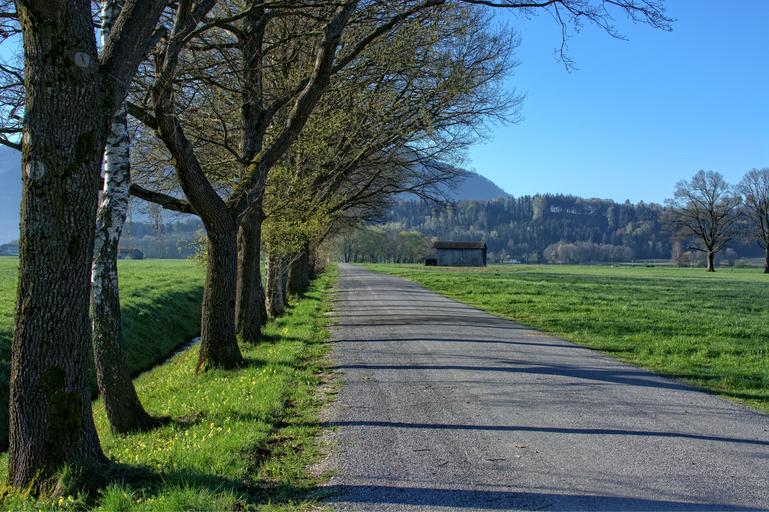 Keywords: road away trees avenue nature wide distant spring landscape bavaria chiemgau holiday recovery meadow green pasture