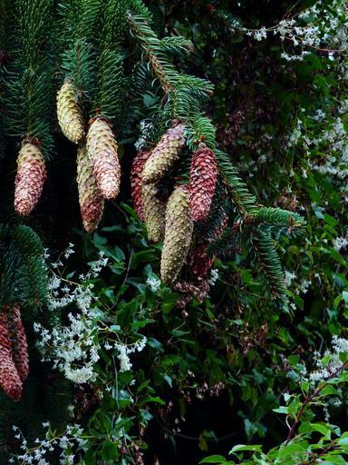 Keywords: road brown fruit green autumn sky time of year needles seed scale pine needles pine cones partly cloudy tap branch