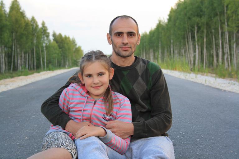 Keywords: road family man girl stroll journey life style cohesion trust fidelity jointly forest father daughter love friendship happiness hug relationship