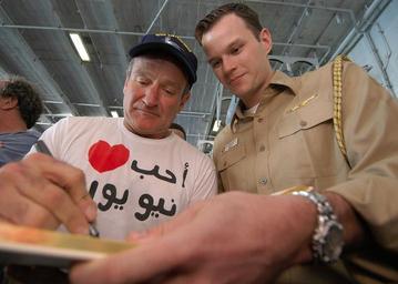 Keywords: Robin Williams USS Enterprise.jpg Caption 031219-N-9742R-003 Arabian Gulf Dec 19 2003 -- Actor/comedian Robin Williams signs an autograph for Lt Matthew Duffy from Chicago Ill during a holiday special aboard USS Enterprise CVN-65 hosted by the United Service Organization USO The show took place in the shipÕs hangar bay and featured the visiting Chairman of the Joint Chiefs of Staff General Richard Myers NASCAR driver Mike Wallace and World Wrestling Entertainment WWE celebrity Kurt Angle Enterprise is currently underway conducting missions in the Arabian Gulf in support of Operation Iraqi Freedom and the continued war on terrorism U S Navy photo by Photographer's Mate Airman Milosz Reterski RELEASED Source http //www news navy mil/view_single asp id 11125 navy mil PD-USGov-Military-Navy Robin Williams |