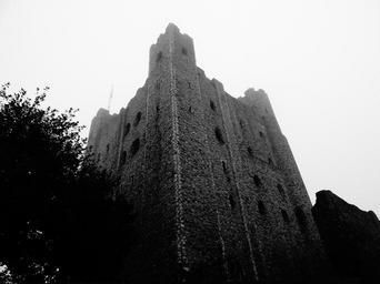 | Keywords: blackandwhite monochrome outdoor black and white Rochester Castle stands on the east bank of the River Medway in Rochester, Kent, South East England. The 12th-century keep or stone tower, which is the castle's most prominent feature, is one of the best preserved in England or France. Situated on the River Medway and Watling Street, Rochester served as a strategically important royal castle. During the late medieval period it helped protect England's south-east coast from invasion. The first castle at Rochester was founded in the aftermath of the Norman Conquest. It was given to Bishop Odo, probably by his half-brother William the Conqueror. During the Rebellion of 1088 over the succession to the English throne , Odo supported Robert Curthose, the Conqueror's eldest son, against William Rufus. It was during this conflict that the castle first saw military action; the city and castle were besieged after Odo made Rochester a headquarters for the rebellion. After the garrison capitulated, this first castle was abandoned. Between 1087 and 1089, Rufus asked Gundulf, Bishop of Rochester, to build a new stone castle at Rochester. He established the current extent of the castle. Though much altered through the centuries, some parts of Gundulf's work survive. In 1127 King Henry I granted the castle to the Bishops of Canterbury in perpetuity. William de Corbeil built the massive keep that still dominates the castle today. Throughout the 12th century the castle remained in the custody of the archbishops. During the First Barons' War (1215–1217) in King John's reign, baronial forces captured the castle from Archbishop Stephen Langton and held it against the king, who then besieged it. The Barnwell chronicler remarked "Our age has not known a siege so hard pressed nor so strongly resisted". After resisting for just over seven weeks, the garrison surrendered. Although the castle had been greatly damaged, with breaches in the outer walls and one corner of the keep collapsed, it was hunger that eventually forced the defenders' hand. The castle did not stay under John's control for long: in 1216 it was captured by the French Prince Louis, who was the new leader of the baronial faction. John died and was succeeded by his son King Henry III in 1216; the next year, the war ended and the castle was taken under direct royal control. Rochester was besieged for the third time in 1264 during the Second Barons' War (1264–1267). The castle's royal constable, Roger de Leybourne, held Rochester in support of Henry III. Rebel armies led by Simon de Montfort and Gilbert de Clare entered the city and set about trying to capture the castle. Again the castle's defenders resisted, though this time with a different outcome. After a week, the rebel armies raised the siege in the face of relief from Henry himself. Although the garrison did not surrender, the castle suffered extensive damage that was not repaired until the following century. The castle saw military action for the last time in 1381 when it was captured and ransacked during the Peasants' Revolt. As Rochester Castle fell out of use its materials were reused elsewhere and custodianship relinquished by the Crown. The castle and its grounds were opened to the public in the 1870s as a park. At various points during the 19th and 20th centuries repairs were carried out. The castle is protected as a Grade I listed building and Scheduled Monument. Today the ruins are in the guardianship of English Heritage and open to the public. Rochester Castle stands on the east bank of the River Medway in Rochester, Kent, South East England. The 12th-century keep or stone tower, which is the castle's most prominent feature, is one of the best preserved in England or France. Situated on the River Medway and Watling Street, Rochester served as a strategically important royal castle. During the late medieval period it helped protect England's south-east coast from invasion. The first castle at Rochester was founded in the aftermath of the Norman Conquest. It was given to Bishop Odo, probably by his half-brother William the Conqueror. During the Rebellion of 1088 over the succession to the English throne , Odo supported Robert Curthose, the Conqueror's eldest son, against William Rufus. It was during this conflict that the castle first saw military action; the city and castle were besieged after Odo made Rochester a headquarters for the rebellion. After the garrison capitulated, this first castle was abandoned. Between 1087 and 1089, Rufus asked Gundulf, Bishop of Rochester, to build a new stone castle at Rochester. He established the current extent of the castle. Though much altered through the centuries, some parts of Gundulf's work survive. In 1127 King Henry I granted the castle to the Bishops of Canterbury in perpetuity. William de Corbeil built the massive keep that still dominates the castle today. Throughout the 12th century the castle remained in the custody of the archbishops. During the First Barons' War (1215–1217) in King John's reign, baronial forces captured the castle from Archbishop Stephen Langton and held it against the king, who then besieged it. The Barnwell chronicler remarked "Our age has not known a siege so hard pressed nor so strongly resisted". After resisting for just over seven weeks, the garrison surrendered. Although the castle had been greatly damaged, with breaches in the outer walls and one corner of the keep collapsed, it was hunger that eventually forced the defenders' hand. The castle did not stay under John's control for long: in 1216 it was captured by the French Prince Louis, who was the new leader of the baronial faction. John died and was succeeded by his son King Henry III in 1216; the next year, the war ended and the castle was taken under direct royal control. Rochester was besieged for the third time in 1264 during the Second Barons' War (1264–1267). The castle's royal constable, Roger de Leybourne, held Rochester in suppo
