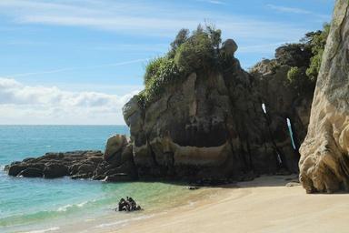 Keywords: Rocks in cove north of Anapai Bay.jpg Rocks in cove north of Anapai Bay Own 2015-04-12 Pseudopanax wikipedia en 40 48 2 2 S 173 0 9 4 E Cliffs of New Zealand Abel Tasman Coast Track