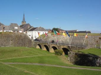 Keywords: rocroi france village town buildings architecture landscape bridge sky clouds trees grass people flags wall stone summer spring nature outside country countryside scenic
