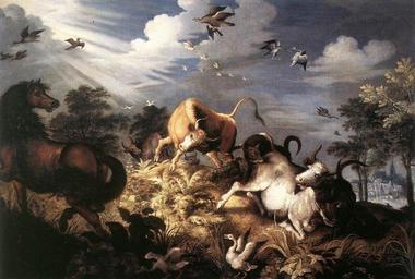 | Keywords: Roelant Savery - Horses and Oxen Attacked by Wolves - WGA20884.jpg Artwork Creator Roelant Savery firsthalf other date century 17 Oil on canvas size cm 111 160 Institution Rockox House Antwerp object history credit line accession number WGA link 20884 http //www wga hu/art/s/savery/horsesox jpg http //www wga hu/html/s/savery/horsesox html PD-old-100 painting landscape Flemish 1601-1650 Roelant Savery Paintings in Rockox House Antwerp 17th-century paintings of animals WGA form painting WGA type landscape WGA School Flemish WGA time period 1601-1650 1601-1650 paintings 17th-century oil on panel paintings in Belgium Wolves in art Fighting animals in art |