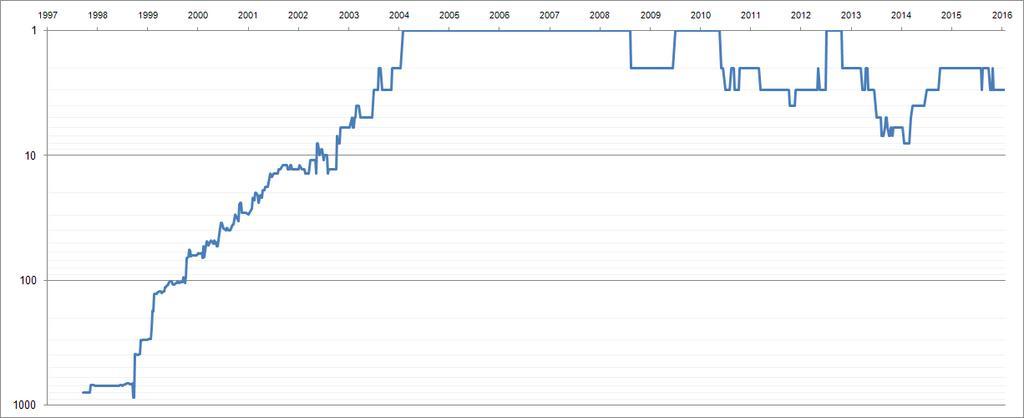 Keywords: Roger-Federer-Singles-Ranking-History-Chart-1997-2015.png Roger Federer Singles Ranking History Overview Chart 1997-2015 <br /> <br /> Note official ATP table has 2 missing data entry points for the following dates/weeks '11/30/1998 ' 30th November 1998 and '2012 07 02' 2nd July 2012 citing an erroneous ranks of 0 which is not technically possible for an intermediate week between several continuous and consecutive weeks that precedes and follows it Thus to prevent a discontinuity in the chart I have manually entered an assumed ranking of '301' and '3' respectively later coincides with Novak Djokovic fall to rank place no 2 and Rafael Nadal fall to place no 3 but since this week no ATP points change occurred I decided to keep their ranking unchanged When the data table gets a proper revision chart will be corrected self-made based on this URL http //www atpworldtour com/en/players/roger-federer/f324/rankings-history created 17 Jul 2015 Darko A7 Darko A7 wikipedia en Cc-zero Original upload log en wikipedia Roger-Federer-Singles-Ranking-History-Chart-1997-2015 png wikitable - 2015-09-14 22 53 1226×500× 13921 bytes Darko A7 <nowiki>simplified x-axis</nowiki> - 2015-09-14 22 40 1226×500× 13992 bytes Darko A7 <nowiki>Re-aligned Human-readable X-axis</nowiki> - 2015-09-14 22 04 1226×500× 14223 bytes Darko A7 <nowiki>Updated Ranking 9/15/2015</nowiki> - 2015-07-17 02 03 1201×500× 9324 bytes Darko A7 <nowiki> Roger Federer Singles Ranking History Overview Chart 1997-2015 <br /> <br /> Note official ATP table has 2 missing data entry points for the following dates/weeks '11/30/1998 ' 30th November 1998 and '2012 07 02' </nowiki> Uncategorized 2015 September 19 |