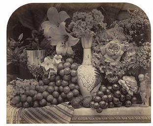 Keywords: Roger Fenton Fruit and Flowers, 1860 Paul Mellon Fund.jpg en Roger Fenton artist British 1819 - 1869 Fruit and Flowers 1860 albumen print from collodion negative Overall 35 5 x 43 cm 14 x 16 15/16 in mount 50 8 x 68 5 cm 20 x 26 15/16 in Paul Mellon Fund National Gallery of Art Brief Guide In the summer of 1860 Fenton made his most deliberate and exacting photographs to date a series of still lifes Although the subject obviously had its roots in painting his densely packed compositions are far removed from the renditions of everyday life by the Dutch masters Instead Fenton extravagantly piled luscious fruits and intricately patterned flowers on top of one another and pushed them to the front of his composition so that they seem almost ready to tumble out of the photograph into the viewer's space It is that very immediacy ”the precarious composition the lush sensuousness of the objects and our knowledge of their imminent decay ”that makes these photographs so striking cs Roger Fenton artist British 1819 - 1869 Fruit and Flowers 1860 albumen print from collodion negative Overall 35 5 x 43 cm 14 x 16 15/16 in mount 50 8 x 68 5 cm 20 x 26 15/16 in Paul Mellon Fund National Gallery of Art Brief Guide In the summer of 1860 Fenton made his most deliberate and exacting photographs to date a series of still lifes Although the subject obviously had its roots in painting his densely packed compositions are far removed from the renditions of everyday life by the Dutch masters Instead Fenton extravagantly piled luscious fruits and intricately patterned flowers on top of one another and pushed them to the front of his composition so that they seem almost ready to tumble out of the photograph into the viewer's space It is that very immediacy ”the precarious composition the lush sensuousness of the objects and our knowledge of their imminent decay ”that makes these photographs so striking http //www nga gov/fcgi-bin/tinfo_f object 132371 Creator Roger Fenton 1860 PD-old-100 Roger Fenton |