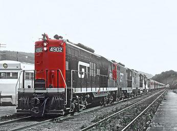| Keywords: central vermont grand trunk western grandtrunkwestern locomotive railroad vehicle train outdoor The lead units were spiffed up GTW GP9s. At Brattleboro, VT The lead units were spiffed up GTW GP9s. At Brattleboro, VT The lead units were spiffed up GTW GP9s.