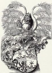 | Keywords: Roggendorf Freiherren Wappen (Duerer).jpg Wappen der von Rogendorff nach einem um 1520 gefertigten großen Holzschnitt von Albrecht Dürer für welchen der Meister sieben Ellen Samt als Rekompens erhielt Das Größenverhältnis der einzelnen Teile des Wappens ist geändert das Kleinod nimmt nahezu die Hälfte der ganzen Höhe ein Die Form der Helmdecke charakterisiert alle Dürerschen Wappenzeichnungen Die Auffassung der Tiere ist naturalistisch http //peter-hug ch/lexikon/1888_bild/16_0384a Bild_1888 Meyers Konversations-Lexikon 1888; http //peter-hug ch/lexikon/1888_bild/16_0384e Bild_1888 ebd Entwickelung der Wappenkunst Doppelseitige Farbkarte Colin Eisler Dürers Arche Noah Tiere und Fabelwesen im Werk von Albrecht Dürer München 1996 zuerst 1991 Das herrliche Gefieder des Pfaus muß Dürers Aufmerksamkeit erregt haben Dennoch weiß man von keiner bedeutenden Studie zu diesem Vogel dessen kostbares Fleisch man ebenso preist wie seine wunderbaren Federn Ein Pfau befindet sich unter dem Glücksrad auf dem Holzschnitt Der Fuchs und die Zeit drehen das Glücksrad Da er sich hier offenbar fehl am Platz fühlt entfaltet er indigniert sein Gefieder nicht Auf Dürers Wappenholzschnitt von 1520 stecken zwölf Pfauenfedern in den Büffelhörnern die der Krone der Roggendorfs entwachsen Das Werk entstand in Antwerpen wo man solche Federn importierte Sie formen einen Strahlenfächer um den drohend aufgerichteten gekrönten Roggendorflöwen herum Indem Dürer ein solch bombastisches Wappen schuf bot sich ihm der sich zeitlebens gern herausputzte die Möglichkeit selbst zum Pfau zu werden denn die reichen Brüder bezahlten ihn mit sieben Ellen kostbaren Seidensamts Wappenholzschnitt Fragment 65 × 47 cm Nürnberg 1520 Albrecht Dürer 1471-1528 PD-Art-100 Wappenrecht Coats of arms by Albrecht Dürer Woodcuts by Albrecht Dürer 1511-1520 Coats of arms of Roggendorf family Engravings in the Germanisches Nationalmuseum |