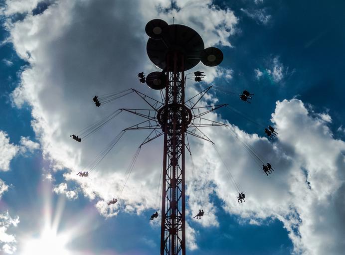 Keywords: roller coaster attraction fun emotion risk family amusement park people have a good time sky speed sun contrast sunset wallpaper background image clouds background