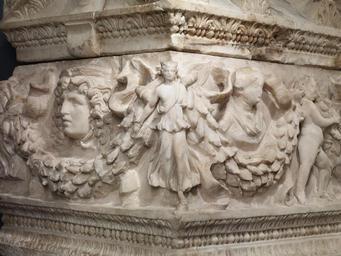 Keywords: Roman - Garland Sarcophagus - Walters 2329 - Detail D.jpg Unlike many sarcophagi this one is carved on all four sides in high relief Garlands held by winged goddesses or personifications on the corners and Eros Cupid figures on the sides support the busts of a crowned deity left and a young girl right The sarcophagus was probably intended for her In the center on both the front and back is a theatrical mask-on this side Tragedy on the other Comedy Medusa heads decorate the ends The lid takes the form of a temple roof with a pediment triangular gable at each end This sarcophagus can be traced to a particular workshop active near the ancient quarry of Dokimeion in Phrygia in Asia Minor Its discovery in Rome illustrates the long-distance trade in even very large heavy luxury goods that took place at the height of the Roman Empire between 150 180 Imperial Dokimeion marble cm 83 5 143 35 69 85 accession number 23 29 30186 Excavated from the so-called Licinian tomb Rome 1885 Don Marcello Massarenti Collection Rome 1885 by excavation Henry Walters city Baltimore Walters Art Museum Henry Walters Acquired by Henry Walters with the Massarenti Collection 1902 Treasures of Heaven The Cleveland Museum of Art Cleveland; The Walters Art Museum Baltimore; The British Museum London 2010-2011 place of origin Phrygia in present-day Turkey Walters Art Museum license Ancient Roman art in the Walters Art Museum Media contributed by the Walters Art Museum needs category review |